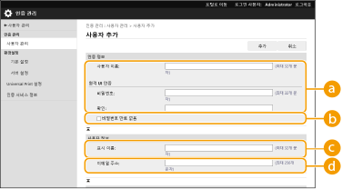 ![]() | 개인 인증 관리를 실행하려면, 먼저 사용자 정보를 기기의 데이터베이스에 등록해야 합니다. |