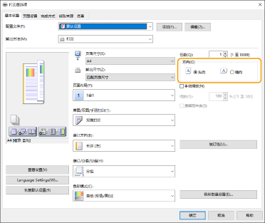 在驱动程序的[基本设置]屏幕上,将[方向]设为在步骤1中设置的相同方向。