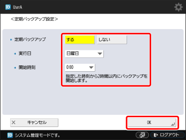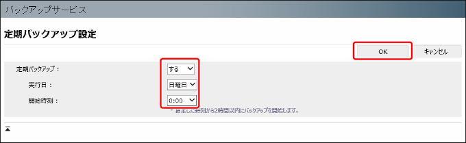 定期バックアップは週に1回です。処理を行う曜日と時刻を選択します。