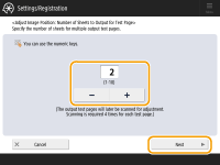 The larger the number of output test pages, the more accurate the adjustment is. If specifying multiple output test pages, make sure that all of the test pages are scanned in the order they are output. If the order is changed or the scanning process is not performed successively, the adjustment may not be made correctly. |