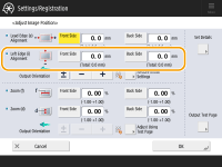To restore the accumulated value, press <Restore Initial Settings>. You can also correct the image position by using the value of register marks shown below. Check whether the center line of the register mark and the edge of the test page are aligned, and adjust the image position as follows: If the center line of the register mark overlaps the edge of the test page exactly, it is unnecessary to adjust the image position. If the center line of the register mark is outside the edge of the test page (the center line of the register mark is NOT printed), check to see which register mark's number the test page line is next to, and input the positive value. If the center line of the register mark is inside the edge of the test page, check to see which register mark's number the test page line is next to, and input the negative value. Center Line of the Register Mark Is Outside the Edge of the Test Page | Center Line of the Register Mark Overlaps the Edge of the Test Page Exactly | Center Line of the Register Mark Is Inside the Edge of the Test Page | | | | ↓ Input "+ 4" to Adjust | ↓ Adjusted Correctly | ↓ Input "- 6" to Adjust |