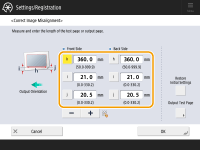 Return to the <Correct Image Misalignment> screen, and enter the measured length of <i> and <j> (for the long sheet: the measured length of <h>, <i>, and <j>) for front and back sides.Using the following two numerical values and "h = 360.0"(for the long sheet: "h = 360.0/450.0/550.0/650.0" for [h] that is closest to the tail edge of the paper), a device adjusts so that the printing area and the paper may become parallel.