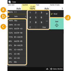 <Orig./Fin. Type>![]() | You can enlarge or reduce copies by using a preset copy ratio such as <A4/LTR->A3>, or by setting a custom copy ratio in increments of 1 %. |