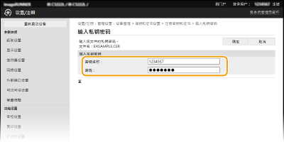 2 | 输入密钥名称和密码。 [密钥名称] 输入字母数字字符,作为要注册的密钥的名称。 [密码] 输入字母数字字符,作为要注册文件而设置的私钥密钥密码。 |