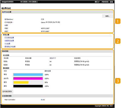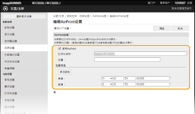 如果选择 [使用AirPrint],<网络> 中的下列设置将设置为 <打开>。<使用HTTP> <IPP打印设置> <使用mDNS> (IPv4) <使用mDNS> (IPv6) <使用Network Link Scan> |