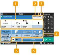 Ezarpen-egoera bistaratzen du; adibidez, kopia-erlazioa, paper-tamaina eta kopia kopurua. Ziurtatu ezarpenak berresten dituzula, ongi kopiatzeko. Ezarpenak aldatzeko, sakatu bistaratze-sekzioaren azpiko botoia.