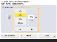 ![]() | Eskaneatze-tamaina baino txikiagoak diren originalak eskaneatzean, baliteke originalen marko-lerroak agertzea eskaneatutako irudian. Liburu lodi bat eskaneatzean, baliteke ertz ilunak agertzea. Funtzio honek marko-lerro eta ertz ilun hauek ezabatzeko aukera ematen dizu. Halaber, makina ezar dezakezu originalen zulaketak kopiatu ez ditzan. |