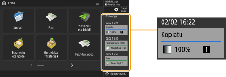 Historiako azken 10 elementuak ordena kronologikoan gordetzen dira denbora-eskalan. Denbora-eskalatik ezabatuko da aurreko lanen historia. Azkenekoaren aurreko lana berriz erabiltzen denean, goiko bi lanen ordena aldatu egingo da baina ez da aldatuko denbora-eskalako lan-kopurua. Hala ere, berreskuratu ostean ezarpenak aldatzen badira, ezarpen berritzat joko dira. ![]() Automatikoki gehitu den historia ezabatzeko edo historia horren ezarpenak <Etxea> pantailan botoi pertsonal/partekatutako botoi gisa gordetzeko, sakatu eta mantendu historia. Hala ere, <Bistaratu berrespen-pantaila berriro deitzean> eta <Hasi berreskuratzeko eragiketa (Botoia sakatzean hasiko da eragiketa).> ezin dira ezarri botoi pertsonal/partekatutako botoia denbora-eskalatik erregistratzean. Botoi pertsonalak/partekatutako botoiak erregistratzea <Mugatu egunkaritik birbidaltzea> ezarrita dagoenean <Bai> egiteko, "Faxa" eta "Eskaneatu eta bidali"-ren historia ez da gordeko denbora-eskalan. Hurrengo pasahitzak barne har daitezke denbora-eskalan saioa hasteko erabiltzaile bakoitzarentzat. Saio-hasierako pasahitzak helmugako fitxategi-zerbitzarietara Eskaneatu eta bidali aukeran Enkriptatze-pasahitzak Eskaneatu eta gorde aukeran (<Pasahitza behar da dok. irekitzeko> eta <Pasahitza behar da baimena aldatzeko>) Saioa hasitako erabiltzailearen denbora-eskalan pasahitza barne hartzea alda daiteke <Debekatu autentifikazio-pasahitza gordetzea>-(e)n. Hala ere, <Pasahitza> pasahitza, fax funtziorako erabiliko dena gorde egingo da denbora-eskalan, kontuan hartu gabe <Debekatu autentifikazio-pasahitza gordetzea> ezarpena. Pasahitza ez da gordeko denbora-eskalan autentifikatu gabeko erabiltzaile edo erabiltzaile gonbidatuentzat, kontuan hartu gabe <Debekatu autentifikazio-pasahitza gordetzea> ezarpena. Hala ere, fax funtziorako <Pasahitza> pasahitza ezarrita badago, ez da bistaratuko denbora-eskalan. <Kudeatu helbide-liburuaren sarbide-zenbakiak> ezarrita badago <Bai>-aukeran, bidalitako lanaren erregistroa ("Faxa" eta "Eskaneatu eta bidali") autentifikatu gabeko erabiltzaile eta erabiltzaile gonbidatuentzat ez da bistaratuko denbora-eskalan. Saioa hasi duen erabiltzailearen ezarpenen historia hainbat makinarekin parteka daiteke datu pertsonalizatu gisa ezarpenen sinkronizazioa erabiliz. Pertsonaliza daitezkeen elementuen zerrenda Gordetako fitxategiak aukerari esker, fitxategiak denbora-eskalan gordetzen dira inprimatutako ezarpenekin batera. Ezin duzu beste fitxategi bat hautatu eta ezarpenak soilik berrerabili. Dagokion denbora-eskalaren ezarpenak ere ezin dira erabili fitxategia ezabatu edo mugitu bada. |