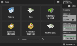 (Hasiera) sakatuz, <Etxea> pantaila bistaratzen da. <Etxea> pantailak funtzio-botoi eta ekintzen zerrenda erakusten du sarrera gisa hainbat funtziotarako. Elementu bistaratuta <Hasiera> pantailan
