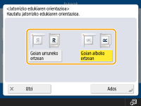 Dokumentuaren orientazioa zehaztu eta inprimatze-orientazioa zehazteko, sakatu <Ezarri xehetasunak>. Hautatu <Liburu mota> dokumentuaren aurrealdeak eta atzealdeak goitik beherako orientazio bera dutenean. Hautatu <Egutegi mota> dokumentuaren aurrealdeak eta atzealdeak aurkako goitik beherako orientazioa dutenean. Kopiaren orri-orientazioa ere ezar dezakezu <Liburu mota> edo <Egutegi mota> aukerarekin.