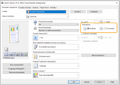 1 | Hautatu originalaren orientazioa aplikazioaren inprimatze-ezarpenen pantailan. |