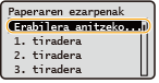 Paper-ezarpen lehenetsia erregistratu ondoren, papera kargatzean ez da paper-ezarpenen pantaila bistaratuko eta beti ezarpen bera erabiliko da. Paper-ezarpenak aldatu gabe beste paper-tamaina edo mota bat erabiltzen baduzu, baliteke makinak behar bezala ez inprimatzea. Arazo hau saihesteko, hautatu <Zehaztu papera kargatzean> 3. urratsean eta ondoren kargatu papera. |