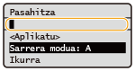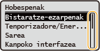 Pantailaren inguruko hainbat ezarpen aldatzeko aukera duzu, adibidez, pantailaren hizkuntza: <Bistaratze-ezarpenak> Makina zehaztutako hainbat denboraz erabiltzen ez denean automatikoki bistaratzen den pantaila aldatu dezakezu: <Berrabiarazte auto. ondorengo funtzioa> Irisgarritasunarekin lotutako hainbat ezarpen aldatzeko aukera duzu; adibidez, korritzeko abiadura: <Erabilerraztasuna> |