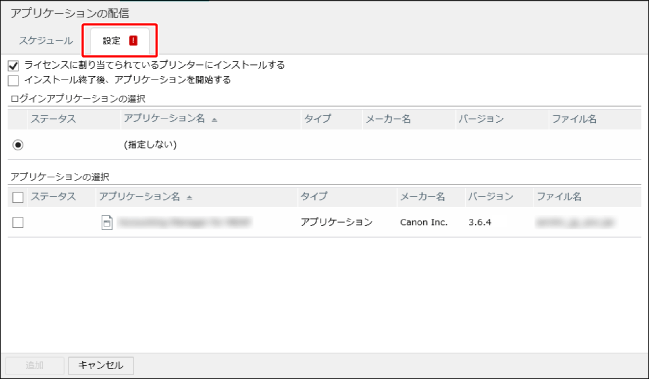 プリンターにインストール済みのアプリケーションと同じバージョンのアプリケーションをタスクの対象にした場合は、プリンターへのインストールを実行しません。 |