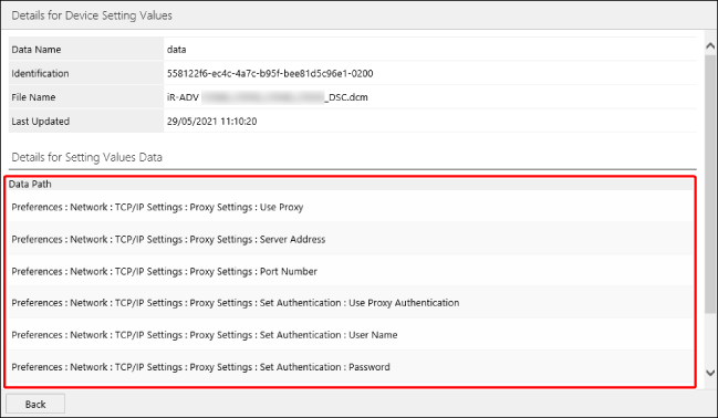 By default, the path format is not used for displaying the [Data Path] field displayed on the [Details for Device Setting Values] page. To display it in the path format, it is necessary to register the settings file of Device Settings Configurator to this software. For details, see the following. |