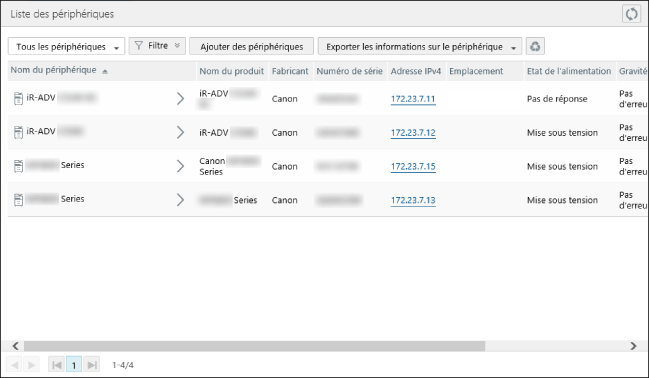 [Etat de l'alimentation] [Gravité] [Réponse (niveau de formation)] | Cliquez sur l'un des éléments pour prendre connaissance des informations détaillées concernant l'état du périphérique et de l'historique des erreurs sur la page [Etat détaillé]. Pour plus d'informations, voir : [Etat de l'alimentation] : [Inconnu(e)] S'affiche lorsque les informations sur l'état du périphérique n'ont pas pu être récupérées du périphérique. [Etat de l'alimentation] : [Conflit] S'affiche lorsque la combinaison de l'adresse MAC et de l'adresse IP du périphérique enregistrée dans ce logiciel diffère des informations récupérées du périphérique. Refaites une recherche du périphérique de sorte que les informations effectives du périphérique soient répercutées dans ce logiciel. Pour plus d'informations, voir : [Gravité] et [Réponse (niveau de formation)] Si plusieurs erreurs se produisent, les informations sur l'erreur la plus grave s'affichent. |