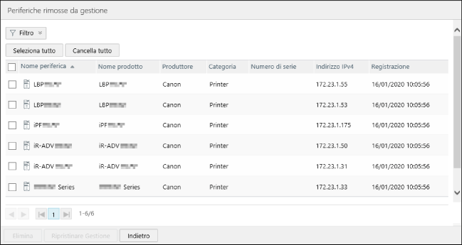 È possibile verificare quali periferiche da gestire sono state eliminate nella pagina [Periferiche rimosse da gestione]. Fare clic su [