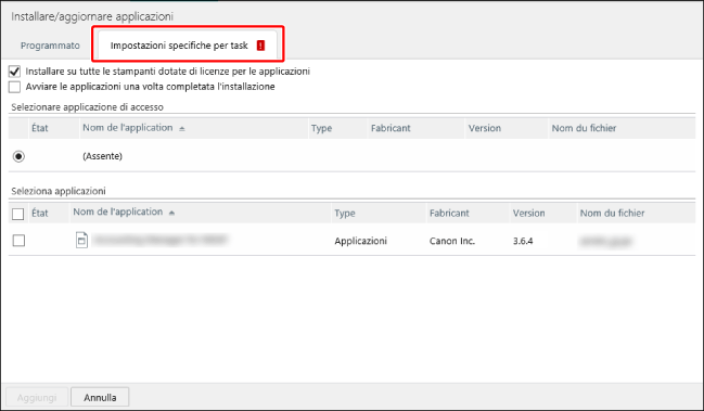 Se per un task viene selezionata la stessa versione di un'applicazione già installata in una stampante, questa non verrà installata. |