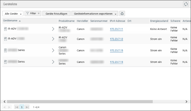[Energiezustand] [Schwere] [Antwort (Ausbildungsstufe)] | Klicken Sie auf eine der beiden Optionen, um detaillierte Informationen zum Gerätestatus und zum Fehlerverlauf auf der Seite [Detaillierter Status] zu überprüfen. Näheres dazu finden Sie hier: [Energiezustand]: [Unbekannt] Wird angezeigt, wenn Statusinformationen aus dem Gerät nicht abgefragt werden konnten. [Energiezustand]: [Konflikt] Wird angezeigt, wenn die Kombination aus MAC-Adresse und IP-Adresse des in dieser Software registrierten Geräts nicht mit den vom Gerät abgefragten Informationen übereinstimmt. Führen Sie eine Erkennung des Geräts erneut durch, um die aktuellen Geräteinformationen in dieser Software zu erfassen. Näheres dazu finden Sie hier: [Schwere] und [Antwort (Ausbildungsstufe)] Wenn mehrere Fehler aufgetreten sind, werden die Informationen zum Fehler mit der höchsten Schwere angezeigt. |