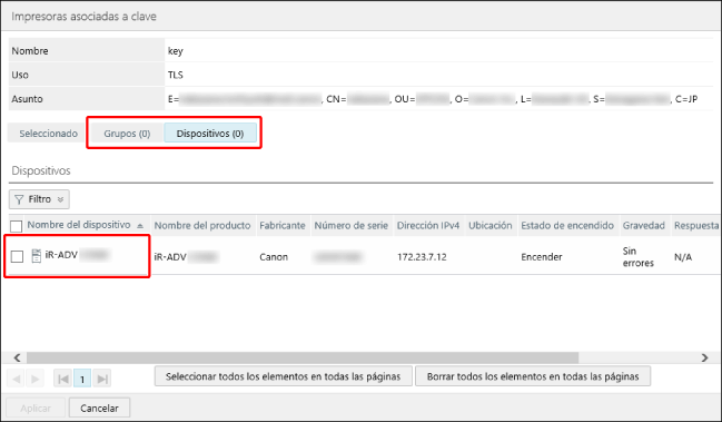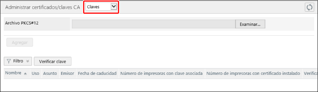 [Número de impresoras con certificado instalado] | Número de impresoras con la clave instalada. Haga clic en esta opción para mostrar una lista de las impresoras instaladas. |