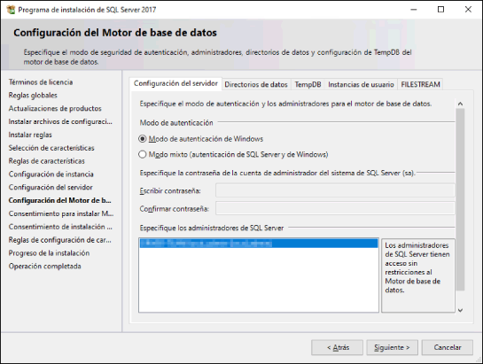 Instale una versión de SQL Server que sea compatible con este software. Establezca el nombre de instancia y el modo de autenticación de SQL Server durante la instalación. Configure el usuario que se utiliza en este software tras la instalación.