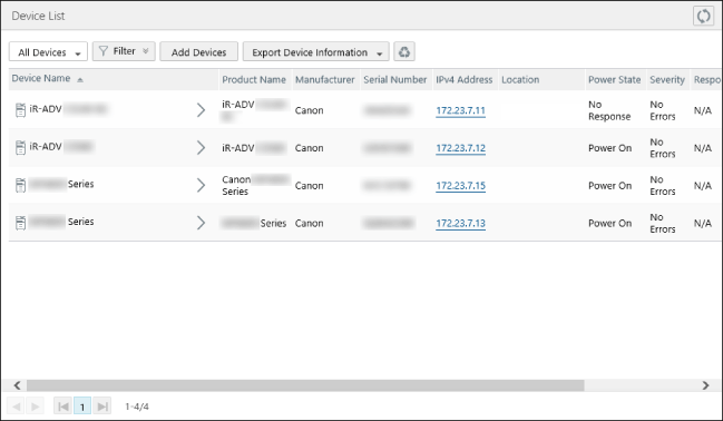 [Power State] [Severity] [Response (Training Level)] | 单击其中一项,以在 [Detailed Status] 页面上检查设备状态的详细信息和错误历史记录。有关详细信息,请参见以下内容。 [Power State]:[Unknown] 无法从设备检索状态信息时显示。 [Power State]:[Conflict] 在本软件中注册的设备 MAC 地址和 IP 地址组合与从设备检索到的信息不符时显示。重新发现设备以在本软件中反映实际的设备信息。有关详细信息,请参见以下内容。 [Severity] 和 [Response (Training Level)] 发生多个错误时,会显示具有最高严重性的错误信息。 |