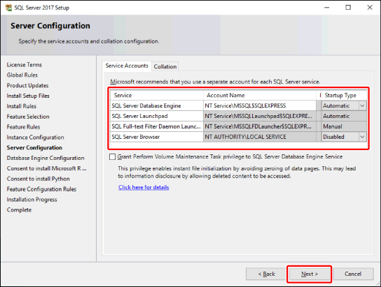 确认 [Service Accounts] 选项卡显示在 [Server Configuration] 屏幕上,如下所示,然后单击 [Next]。