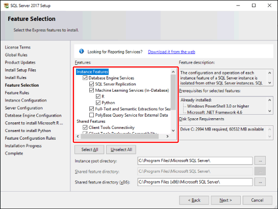 本软件运行不需要 [Machine Learning Services (In-Database)] 及其下面的功能。如果您不想安装,则取消选择它们。