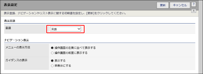 [表示言語]で[英語]を選択したあと、[更新]をクリックします。