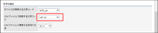 [文字の設定] > [CSVファイルで使用する文字コード]で[utf-16]を選択したあと、[更新]をクリックします。