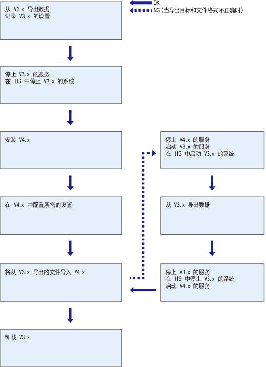 将 Enterprise Management Console V4.x 安装到运行 iW Management Console V3.x 的同一台计算机时,请确认下面流程图中的操作流程。