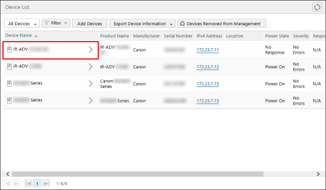 检查是否已从设备检索信息。如果在 iW Management Console V3.x 的 [Device List] 中输入了 [Comments],请参阅这些信息,在于 Enterprise Management Console V4.x 的 [Device List] 中注册的设备的 [Device Details] 页面上,输入 [Note 1] 和 [Note 2]。