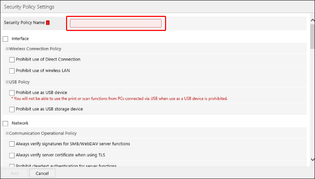 在 [Security Policy Settings] 页面上,在 [Security Policy Name] 中输入指示安全策略内容的名称。