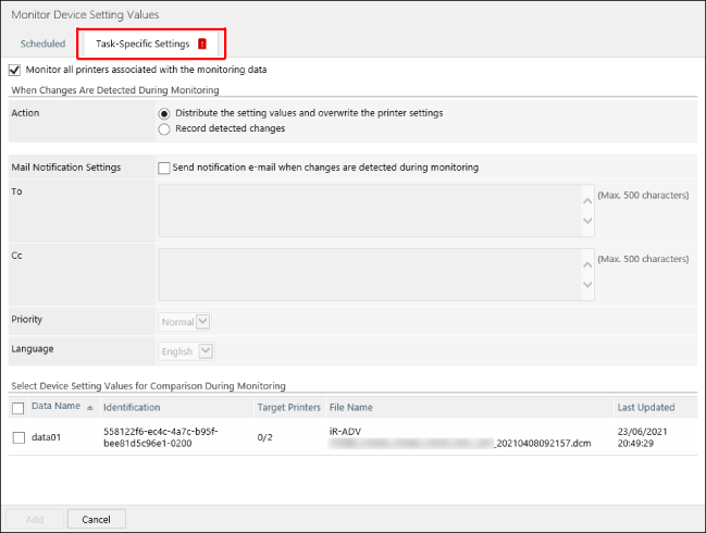 在 [Task-Specific Settings] 选项卡上,选择设备设置值数据的监控条件。