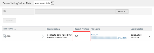 在 [Device Setting Values Data] 页面上的列表中,单击设备设置值数据中的 [Target Printers]。