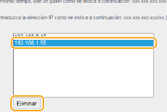 Cuando se selecciona [Rechazar] para un filtro de salida Los paquetes de difusión y multidifusión de salida no pueden filtrarse. Eliminación de una dirección IP de las direcciones excluidas Seleccione una dirección IP y haga clic en [Eliminar]. ![]() | ||||||||||||||