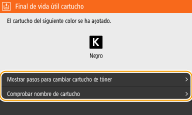 Este mensaje le informa de que muy pronto deberá sustituir un cartucho de tóner. Asegúrese de contar con un cartucho de tóner de sustitución. Sustituya el cartucho de tóner si visualiza este mensaje antes de comenzar a imprimir un trabajo grande. Aparece cuando <Acción cuando aparece una advertencia> está establecido en <Detener la impresión> (