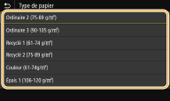 Si l'écran illustré ci-dessus ne s'affiche pas lorsque le papier est chargéSi vous chargez toujours le même papier dans le bac multifonctions, vous pouvez vous épargner les opérations de réglage du format et du type de papier à chaque impression en les définissant par défaut. Notez que si un réglage par défaut est enregistré, l'écran illustré ci-dessus ne s'affiche pas. Pour afficher l'écran, sélectionnez <Spécifier lors du chargement du papier> (Enregistrement des paramètres papier par défaut du bac multifonctions). |