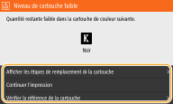 Un message d'avertissement apparaît sur l'afficheur lorsque le niveau de toner restant dans la cartouche est faible ou lorsque l'impression n'est plus possible à cause de l'épuisement du toner. Notez que la qualité d'impression peut souffrir si vous continuez à imprimer sans avoir résolu ce problème. Vous pouvez vérifier sur l'écran le niveau de toner restant dans les cartouches de toner (Vérification de la quantité de consommables restante).