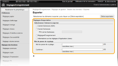 Saisissez en caractères alphanumériques un mot de passe pour crypter les données exportées. Saisissez le même mot de passe dans [Confirmer]. Si la case [Carnet d'adresses] ou [Réglages/Enregistrement] est cochée, les données ne peuvent pas être exportées sans mot de passe.