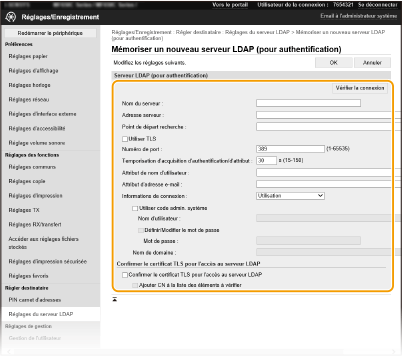 Les serveurs LDAP doivent être enregistrés séparément soit pour la recherche soit pour l'authentification. Pour utiliser un serveur pour la recherche de destinataire de fax et d'e-mails, enregistrez-le pour la recherche, et pour l'utiliser pour l'authentification pour l'envoi d'e-mail ou de fax, enregistrez-le pour l'authentification.