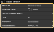 L'adresse IP n'est pas correctement configurée si "0.0.0.0" s'affiche. Connecter l'appareil à un concentrateur de commutation peut entraîner l'échec de la connexion même si l'adresse IP est correctement configurée. Ce problème peut être résolu en retardant le démarrage des communications de l'appareil. Définition d'un délai d'attente en vue de la connexion à un réseau Vous pouvez imprimer la liste des réglages réseau utilisés. Liste des données utilisateur/Liste des données administrateur système |