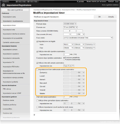 Selezionare la casella di controllo per [Impostazione timer settimanale arresto automatico] e impostare l'ora di spegnimento.