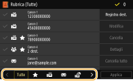 ![]() | È possibile registrare le destinazioni fax/scansione più utilizzate nella Rubrica e selezionarle con facilità quando serve (Registrazione delle destinazioni nella Rubrica). La ricerca delle destinazioni può essere eseguita in ordine alfabetico, dagli elenchi nella Rubrica o immettendo numeri a tre cifre (numeri a selezione codificata). È inoltre possibile specificare le destinazioni in modo più rapido tramite le funzioni seguenti. |