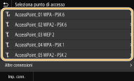 È possibile cercare i router wireless (o punti di accesso) disponibili per la connessione e selezionarne uno dal display della macchina. Per la chiave di rete, inserire una chiave/password di crittografia. Prima di selezionare un router wireless, verificare e annotare le informazioni necessarie all'impostazione, inclusi SSID e chiave di rete (
