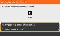 Este mensaje le informa de que muy pronto deberá sustituir un cartucho de tóner. Asegúrese de contar con un cartucho de tóner de sustitución. Sustituya el cartucho de tóner si visualiza este mensaje antes de comenzar a imprimir un trabajo grande. Aparece cuando <Acción cuando aparece una advertencia> está establecido en <Detener la impresión> (