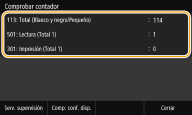 <Serv. supervisión> habilita la comunicación con un servidor de monitorización remoto. Al ejecutar este elemento se permite enviar información sobre el equipo de forma periódica al servidor de monitorización remoto que está conectado al equipo. <Comp. conf. disp.> le permite comprobar las unidades opcionales que están instaladas en el equipo. |