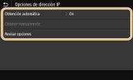 Seleccione esta opción para asignar automáticamente una dirección IP a través del protocolo DHCP. Si se muestra <On>, estará habilitado el direccionamiento automático.