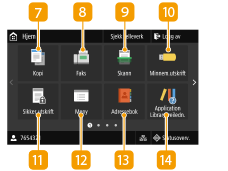 ![]() | <Kopi>Bruk denne knappen til å starte kopiering. Kopiere <Faks>Bruk denne knappen til å sende en faks fra maskinen. Faksing <Skann>Skanner et dokument og konverterer det til en elektronisk fil. Du kan lagre skannede filer på datamaskinen eller sende dem via e-post. Skanning <Minnem.utskrift>Skriver ut filer lagret på en USB-minneenhet. Skrive ut fra en USB-minneenhet (utskrift fra minnemedia) <Sikker utskrift>Bruk denne funksjonen til å skrive ut et sikret dokument. Skrive ut et dokument som er sikret med en PIN-kode (konfidensiell utskrift) <Meny><Funksjonsinnstillinger>, <Preferanser> og mange andre maskininnstillinger har utgangspunkt fra denne knappen. Innstillingsmenyliste <Adressebok>Bruk denne til å lagre eller redigere mottakere for e-poster og fakser. Du kan også vise en lagret mottaker ved sending av en e-post eller faks. Registrere mottakere <Application Library-veiledn.>Viser en beskrivelse av Application Library (Applikasjonsbibliotek). |