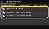 Om <Visa jobblogg> är inställt på <Av> kan du inte kontrollera kopieringsloggar. <Visa jobblogg> |